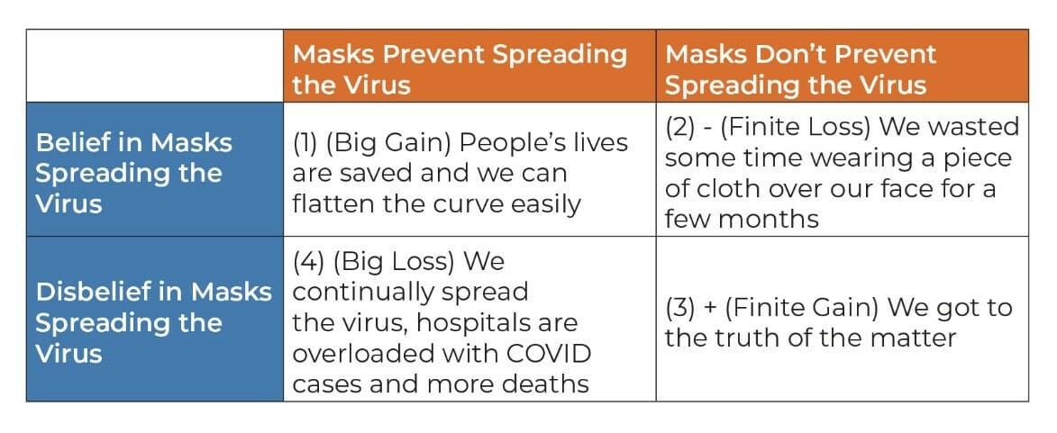 There have of course been criticisms and responses to Pascal’s wager, but you can also apply his wager to the value in mask wearing. Consider: